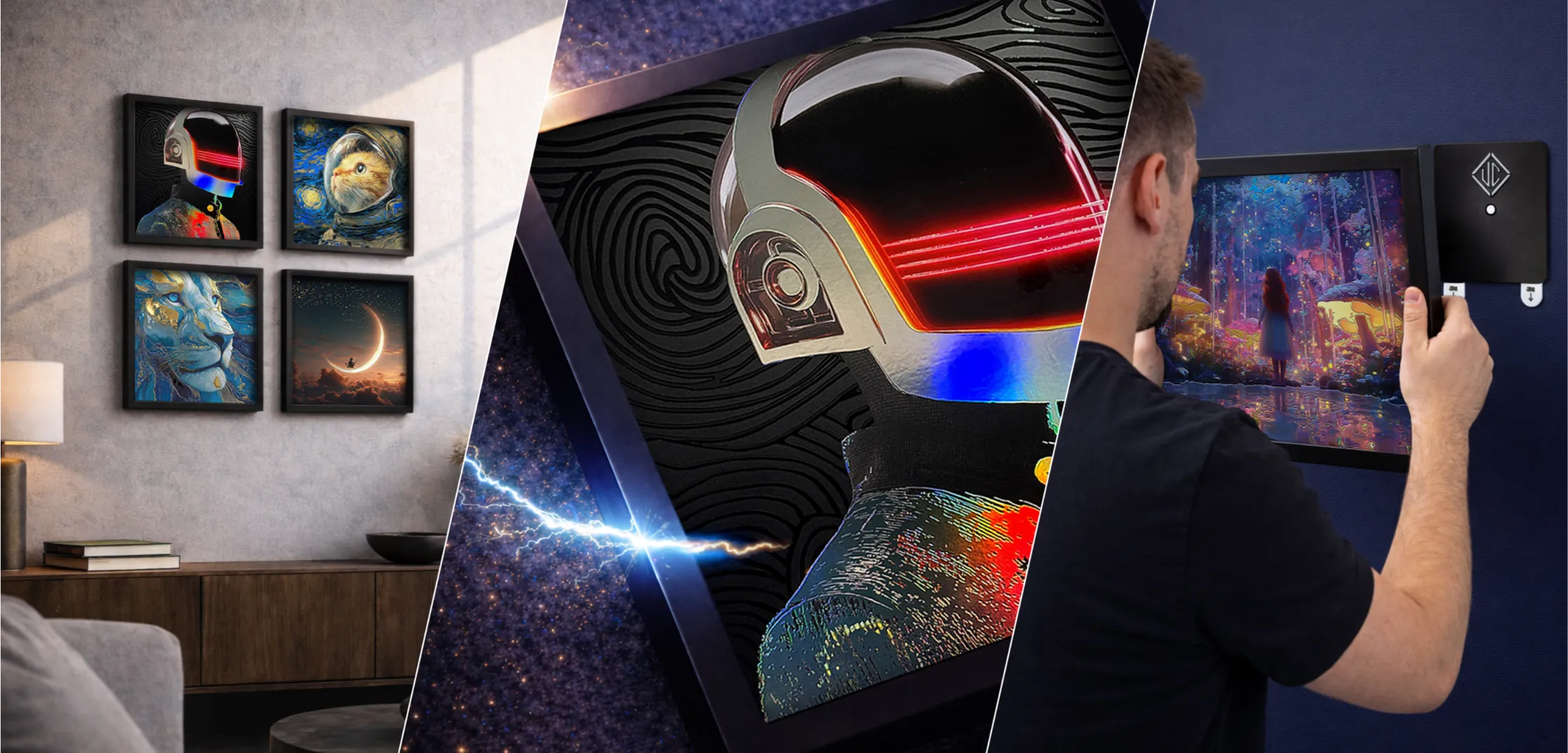 Our custom magnetic system makes hanging effortless and secure. The frame snaps onto a wall-mounted base with perfect alignment and zero visible hardware — quick to install, easy to reposition, and built to last.