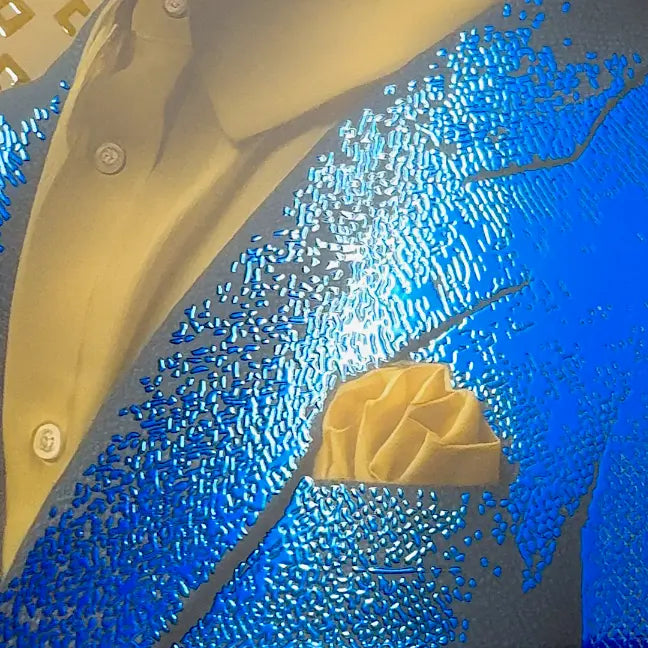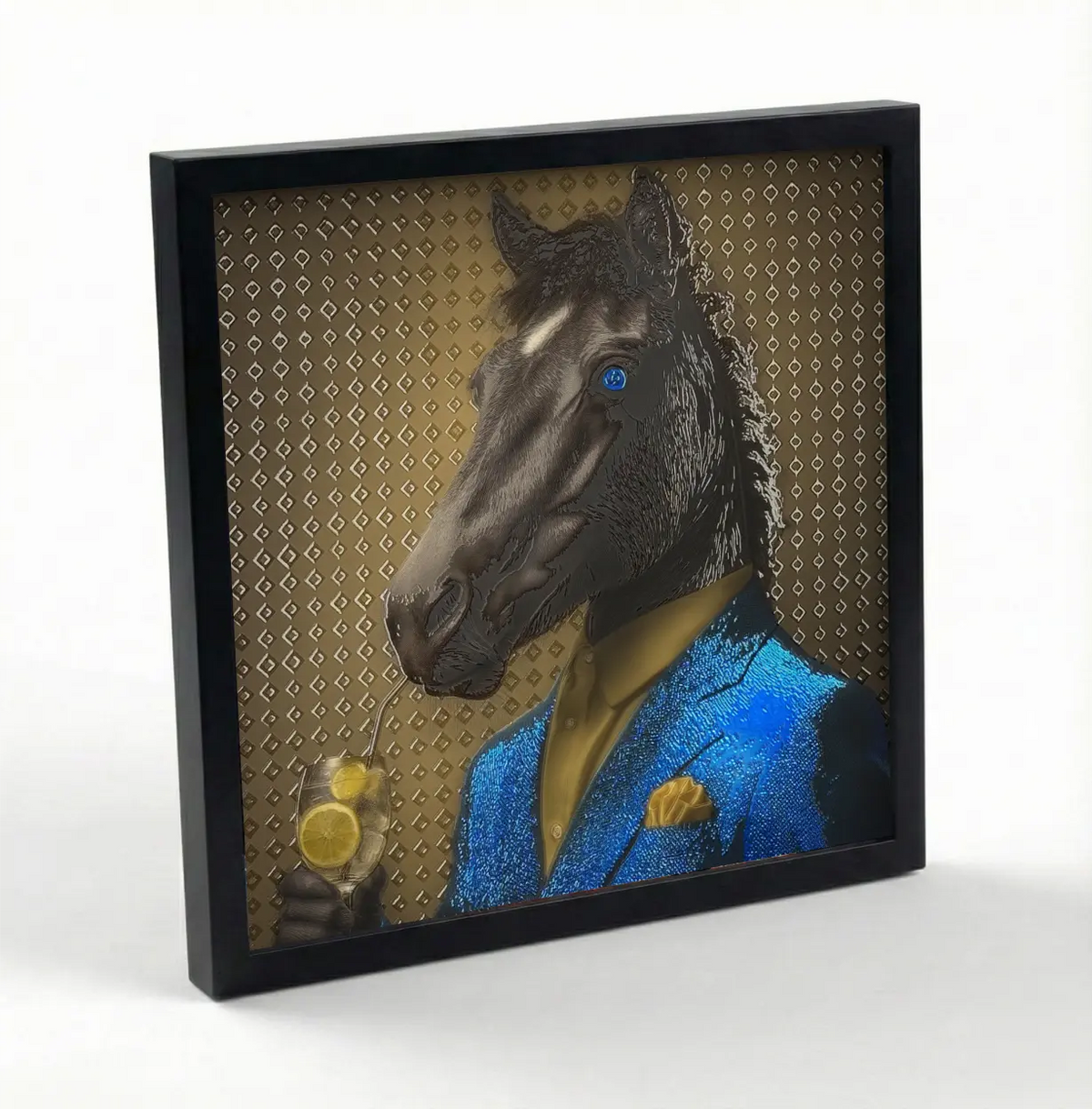 Make a statement with Blue Velvet Horse, a surreal and humorous equine portrait that fuses fashion, absurdity, and luxury. This sharply dressed stallion lounges in a textured golden setting, wearing a shimmering blue foil blazer finished with reflective UV gloss, giving the artwork bold contrast and playful sophistication.