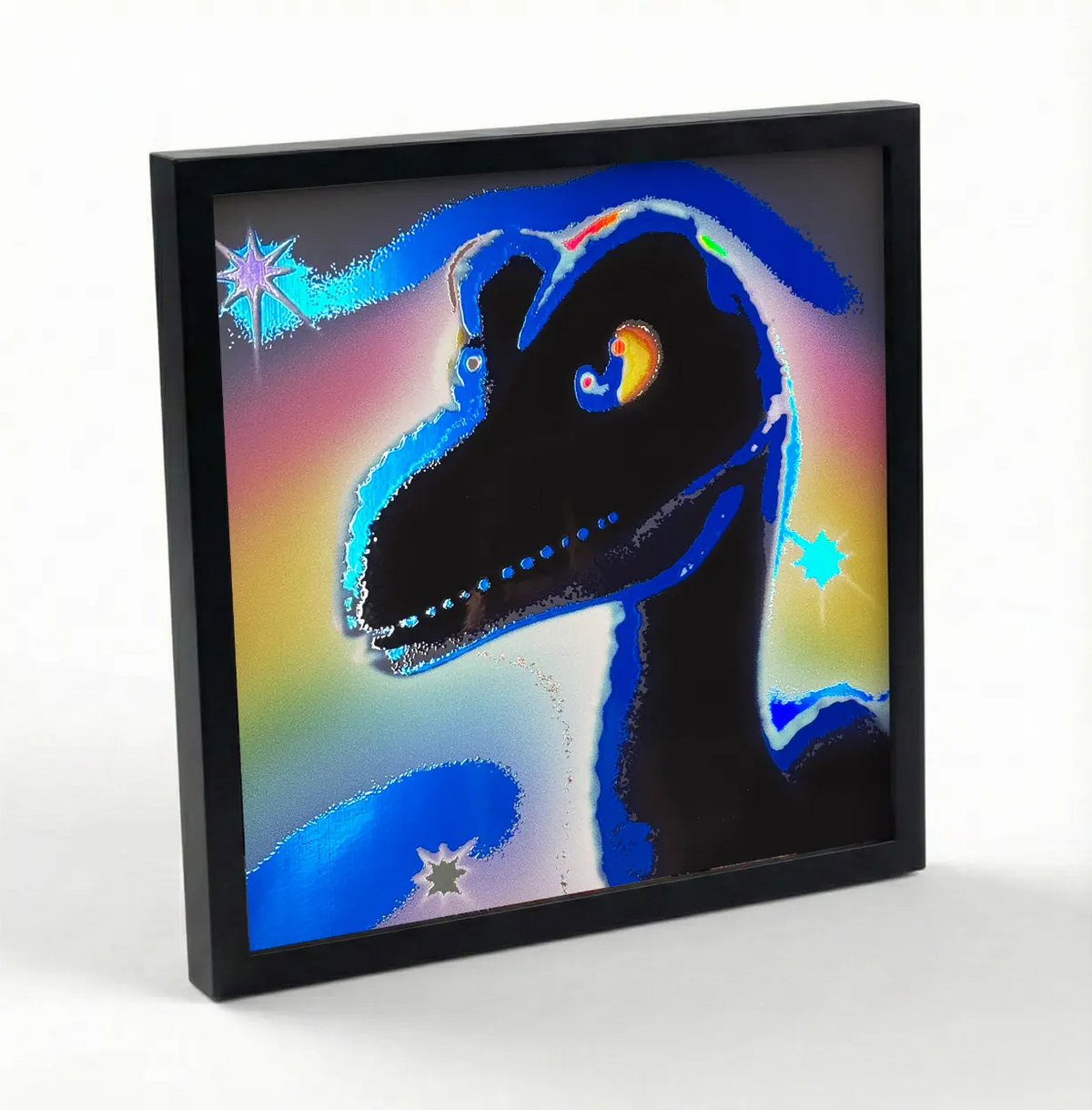 Cosmic Raptor is a bold fusion of prehistoric energy and retro-futuristic flair. This vibrant poster features a cartoon-style dinosaur glowing in deep space, lit with blue foil, holographic foil, and layered UV gloss for rich contrast and cosmic shimmer.