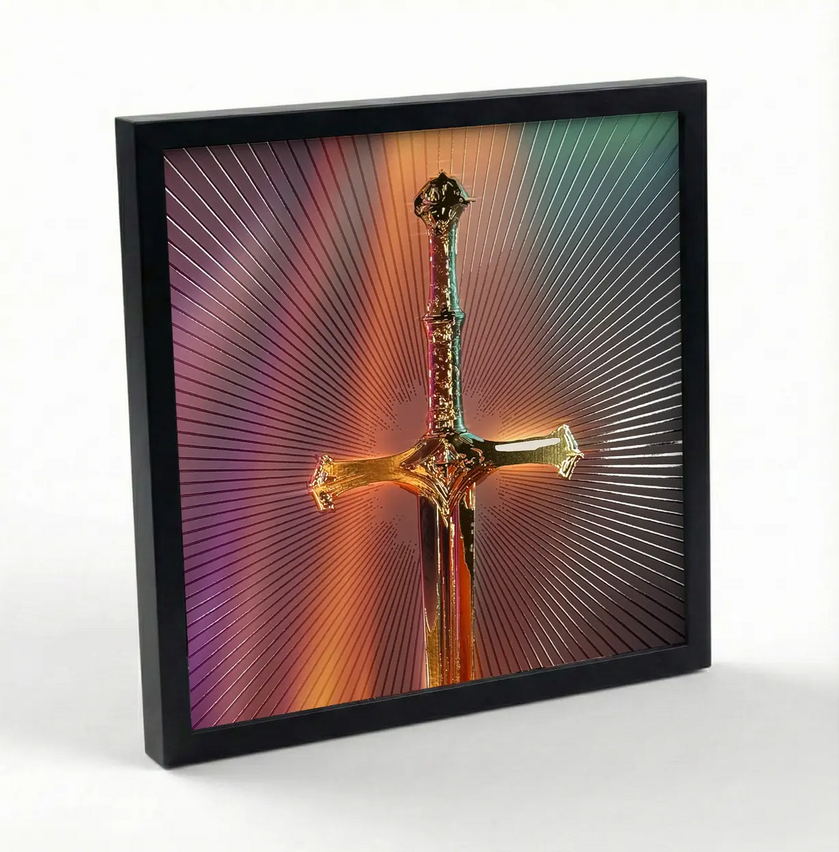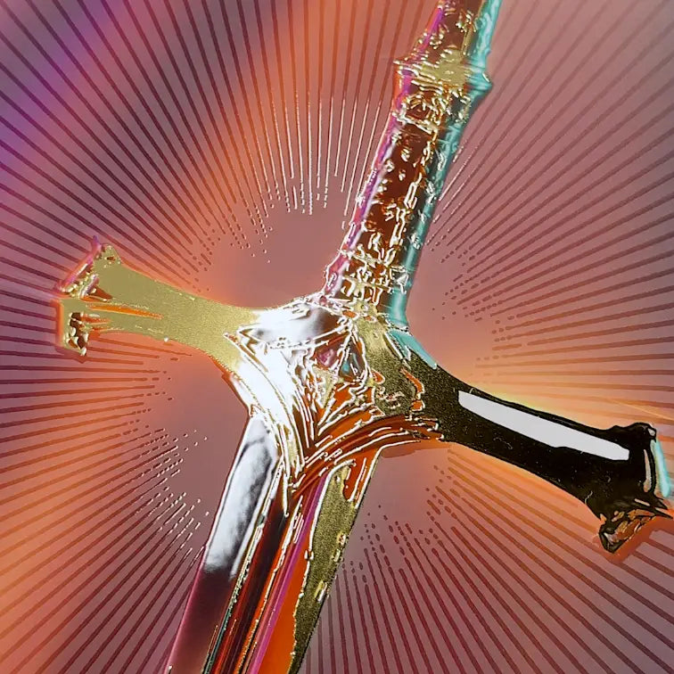 Golden Oath captures the radiant power of a legendary sword suspended in light. Set against a cosmic backdrop, this golden blade glows with shimmering gold foil and UV gloss, adding depth, shine, and a mystical aura to the composition.