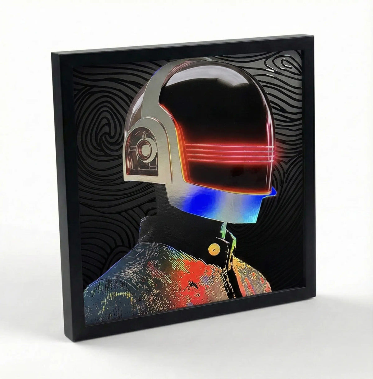 Enter a luminous sci-fi vision with Holo Astronaut, a bold portrait of a neon-lit space explorer in a chrome helmet and iridescent jacket. Enhanced with holographic foil and UV gloss, this 32x32 cm framed poster shimmers with radiant color and dimensional depth — a captivating piece of futuristic wall art.