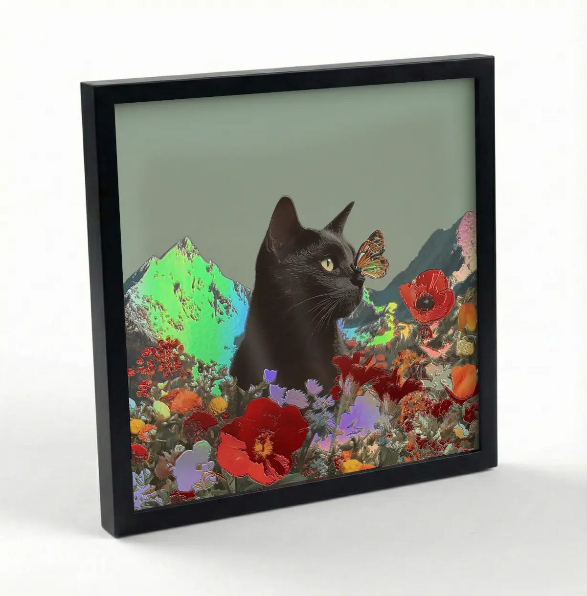 Printed in ultra-high resolution and mounted in a matte black frame, this 32x32 cm square-format poster comes ready to hang with an innovative magnetic mounting system – effortless and tool-free. A magical choice for anyone drawn to cats, nature, or colorful, fantastical decor.