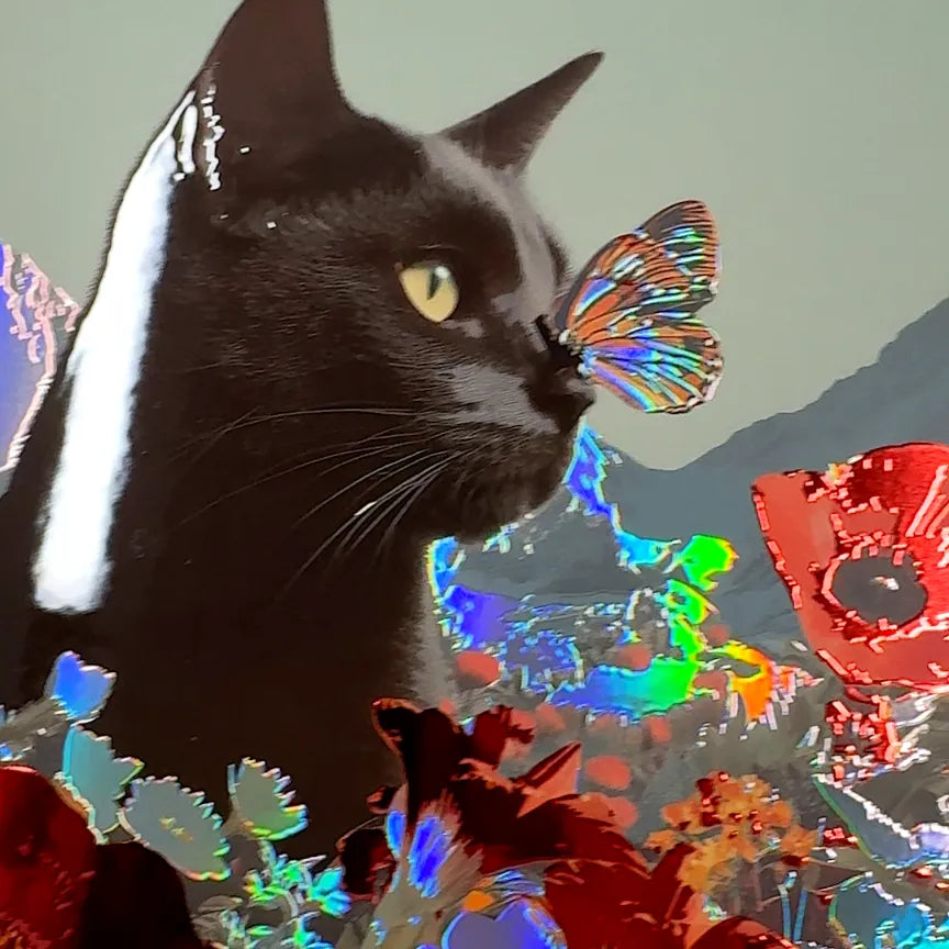 Midnight Bloom invites you into a surreal alpine dream where a sleek black cat meets a butterfly among vivid wildflowers, set against snow-capped peaks. This enchanting scene is enhanced with red foil, holographic accents, and UV gloss for glowing depth and dynamic lightplay.